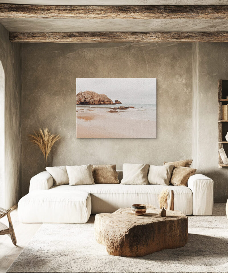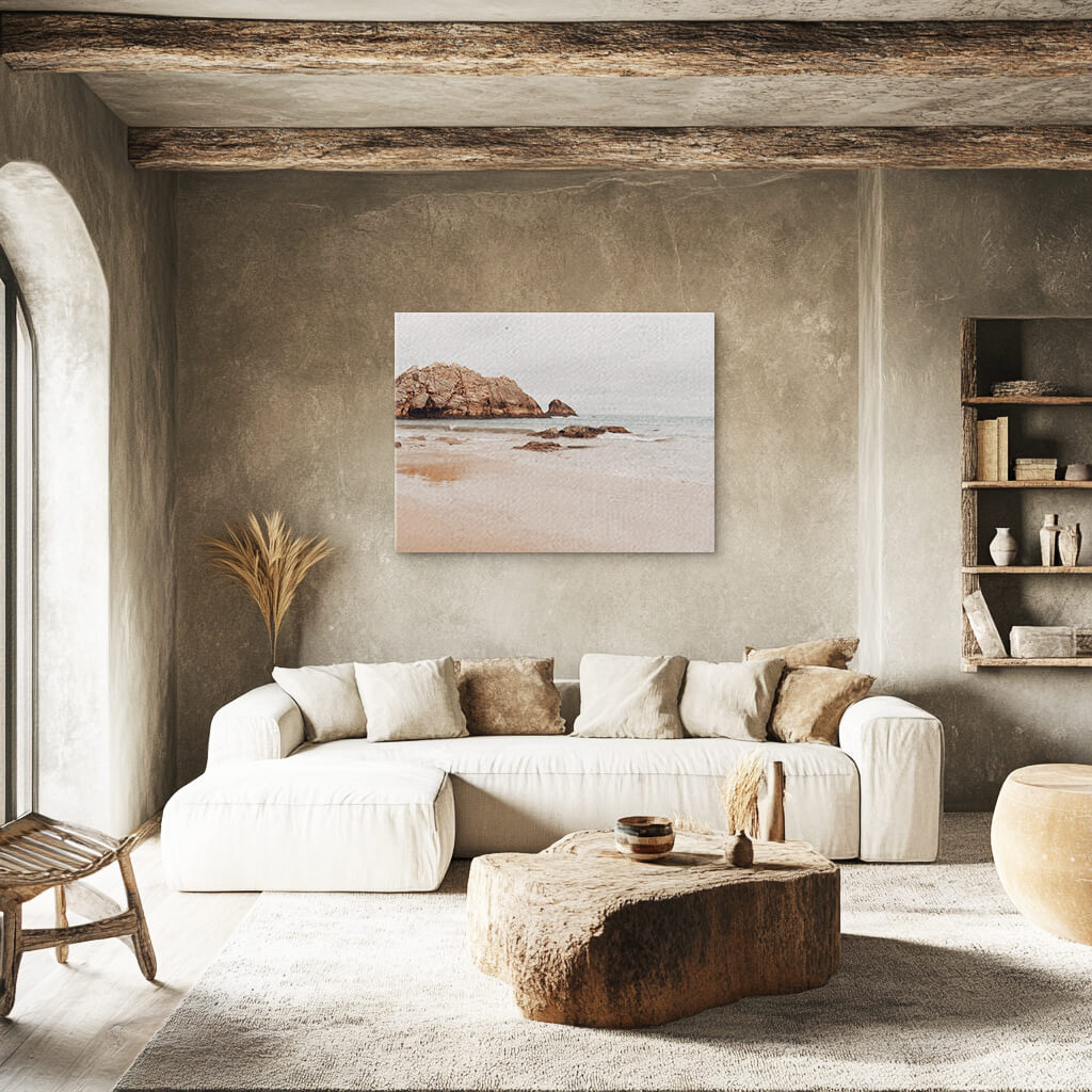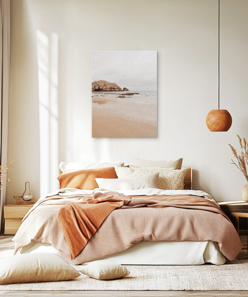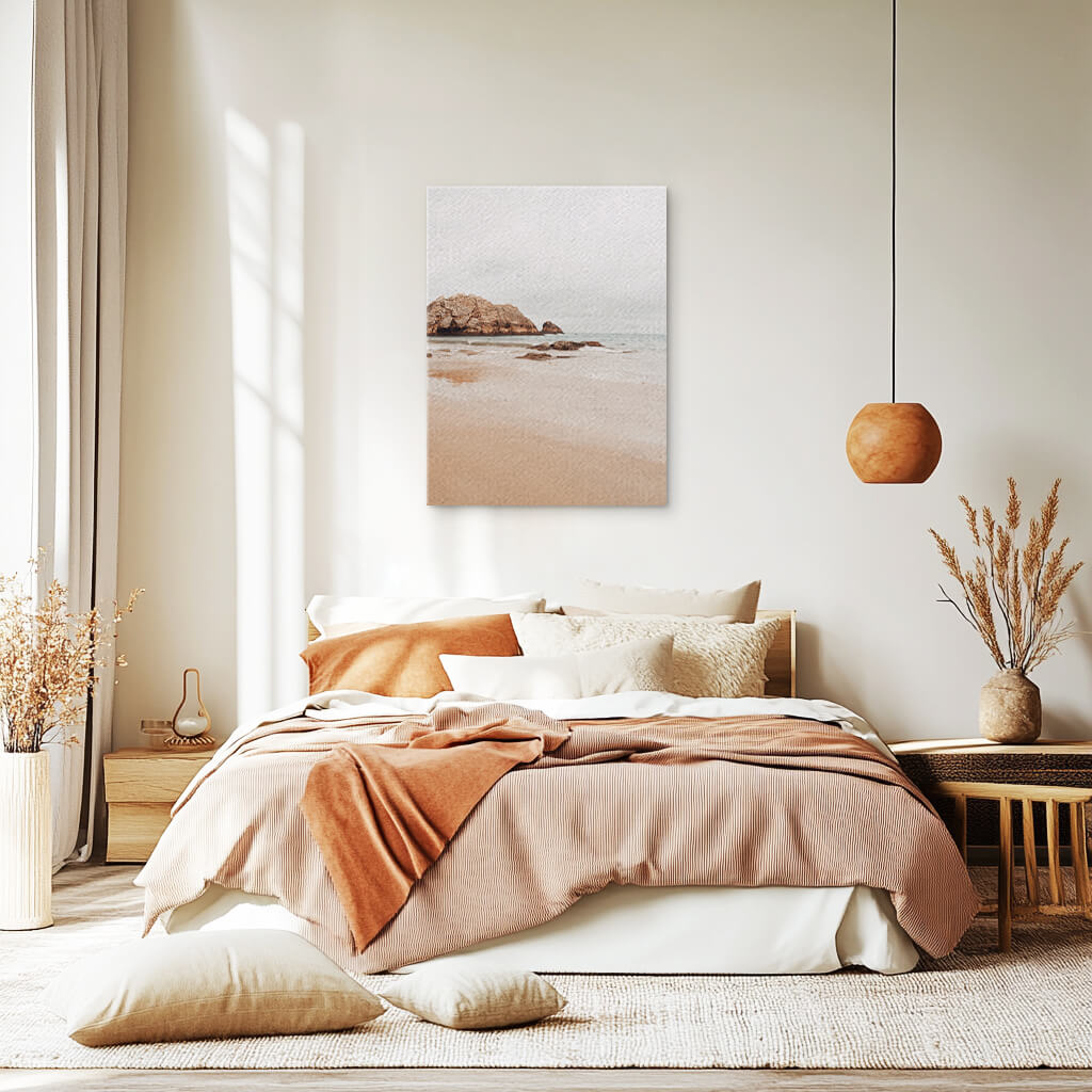 The shoreline glows with washed-out light. Each wave is a soft breath on sand, where stillness lives in the edges of quiet water.