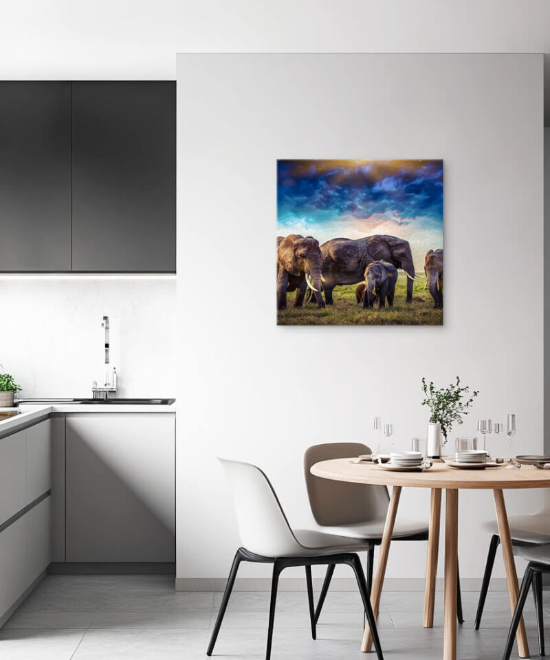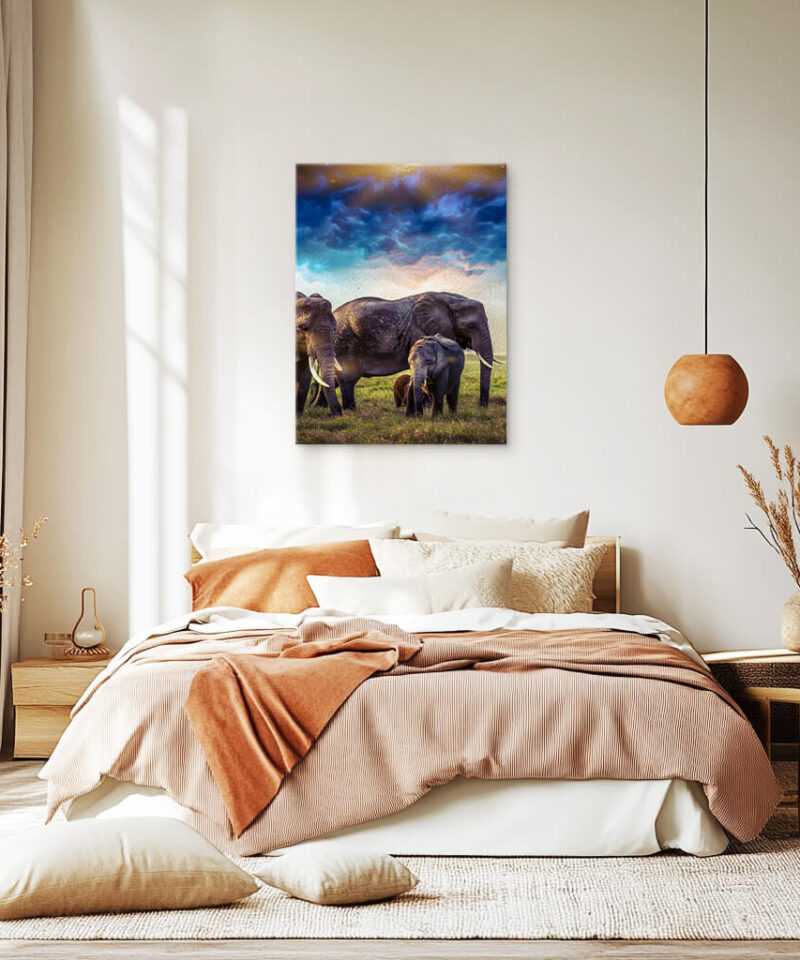 An elephant stands beneath a twilight sky, its form bathed in deep blue hues. It is strength and serenity combined, a monument to the wisdom of time.