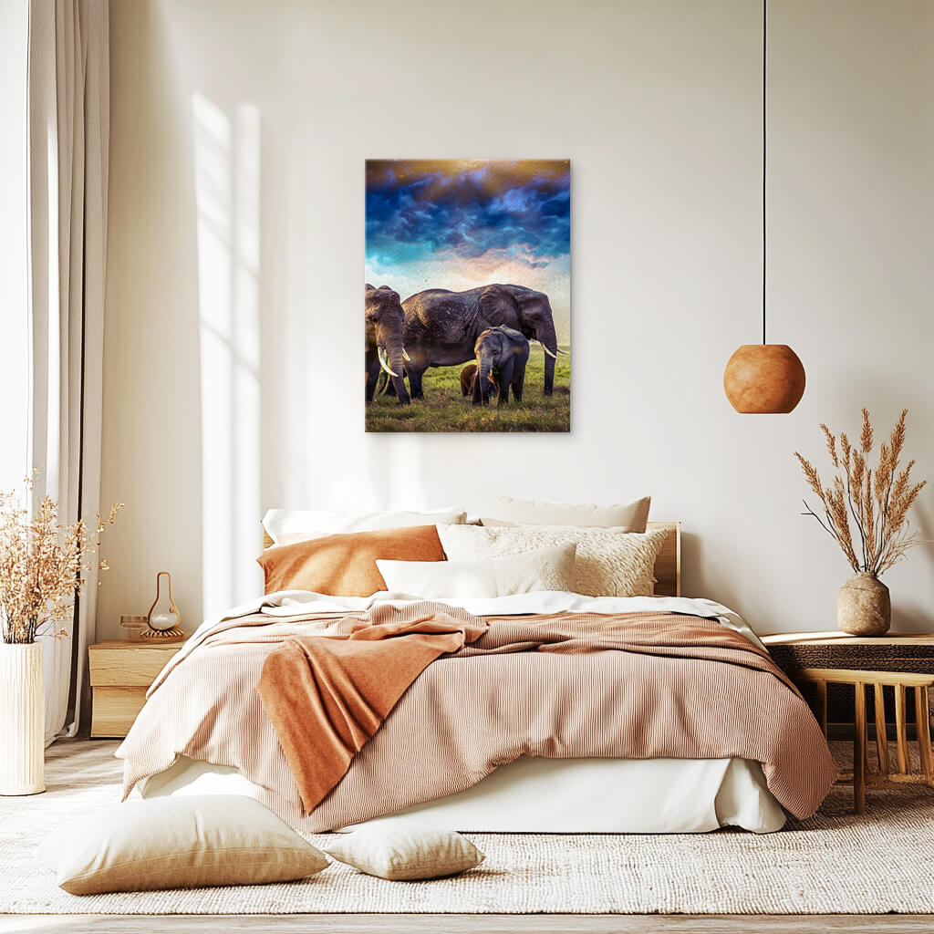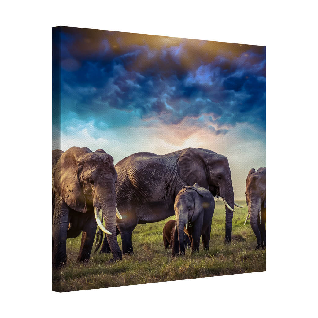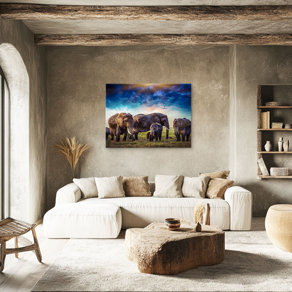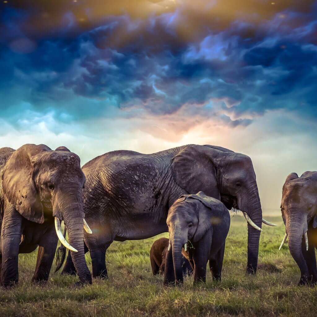 An elephant stands beneath a twilight sky, its form bathed in deep blue hues. It is strength and serenity combined, a monument to the wisdom of time.
