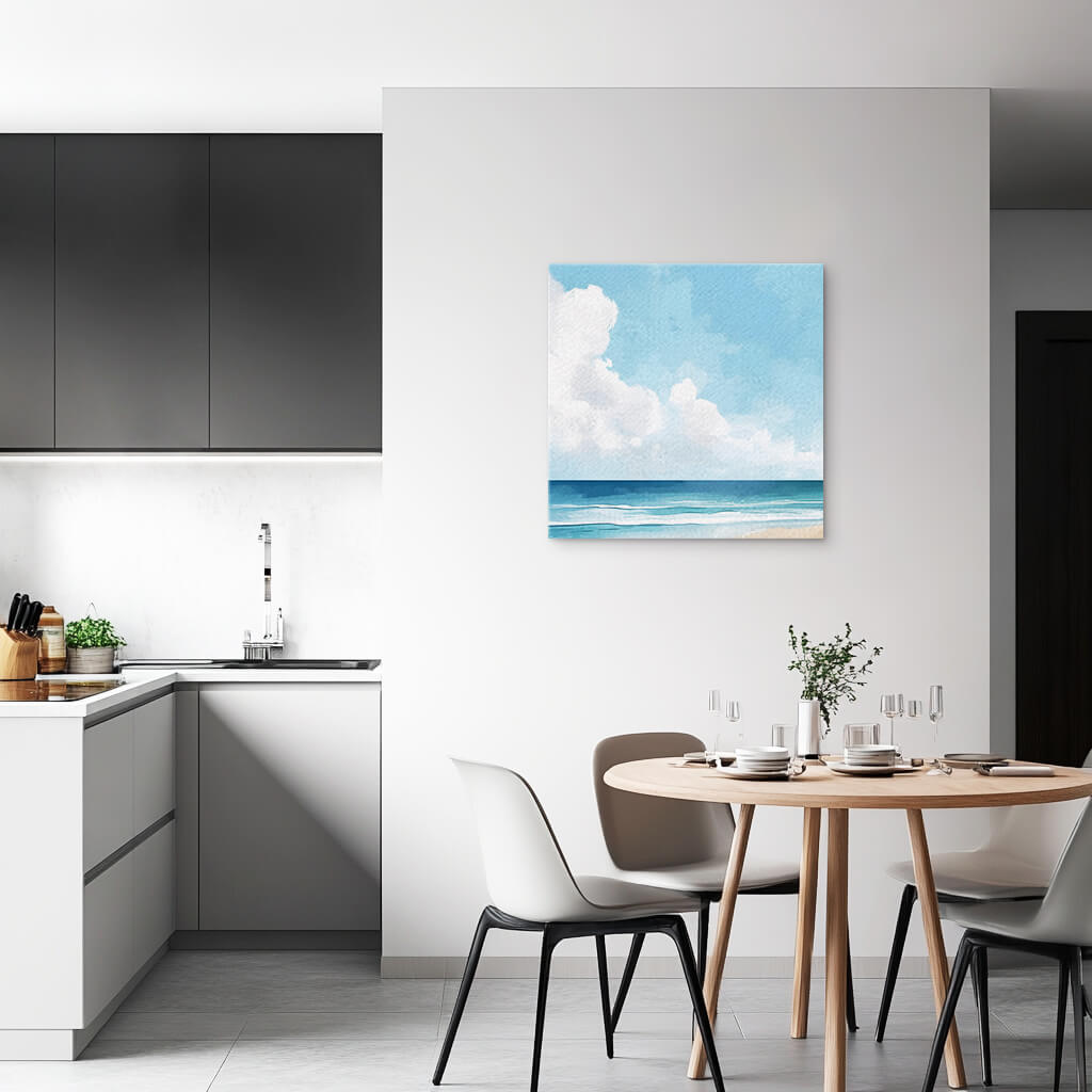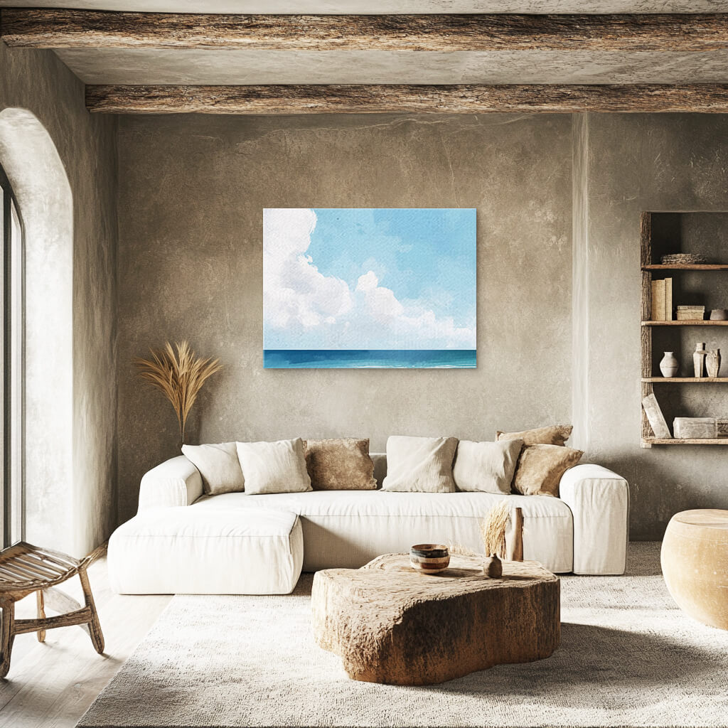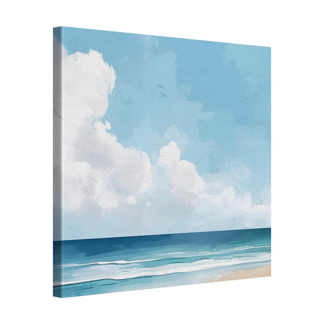 A stretch of beach unfolds into cool blue tones. Each grain and ripple mirrors the slow hush of time, where sea and sky blur in calm harmony.