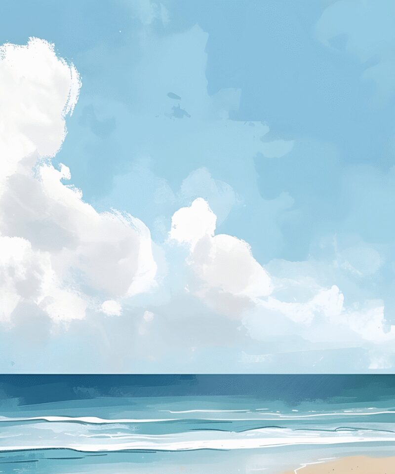 A stretch of beach unfolds into cool blue tones. Each grain and ripple mirrors the slow hush of time, where sea and sky blur in calm harmony.